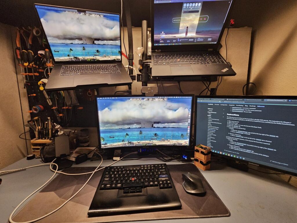 Some time ago I performed switch to the magnificent TEX Shinobi mechanical keyboard. But, with need of usage of 2 laptops on the same table with BT switch between them, popped up urge to utilize more space-efficient setup – hanging laptops on the stands and use the KVM to switch between them.